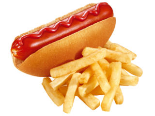 hot dog com ketchup acompanhado de batatas fritas crocantes isolado em fundo transparente