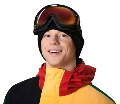 A male snowboarder in gear and helmet, a close portrait of mirrored glasses. Front view. Athlete winter sports. Transparent background, png.