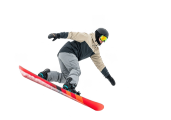 Excited snowboarder in red performing trick, showcasing vibrant energy and skills isolated on transparent background. Concept of winter, sport, activity, travelling, active lifestyle, extreme sport