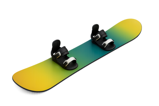 Isolated snowboarding equipment against no background, colorful snowboard with green fasteners