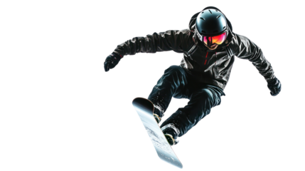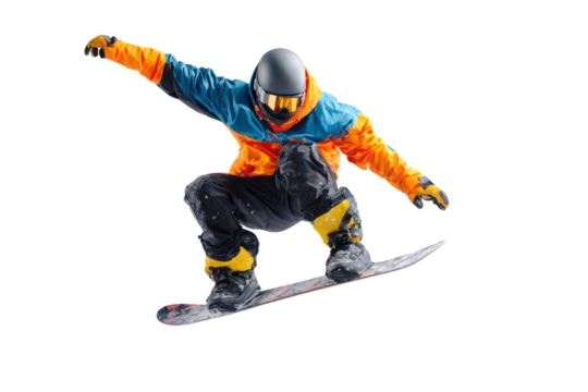 Snowboarder performing a jump in mid-air wearing helmet goggles and winter sports attire isolated on transparent background