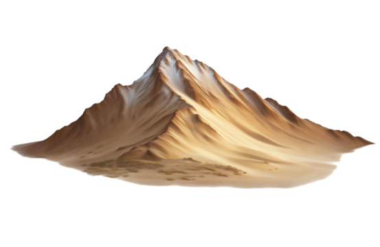 A sharp, pointed mountain peak with snowcapped ridges and sandy slopes, isolated on transparent background