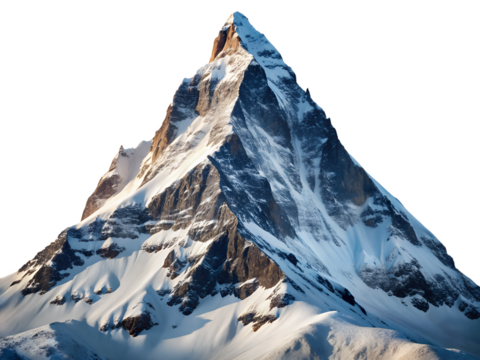 Majestic snowcapped mountain peak illuminated by sunlight, isolated on transparent background