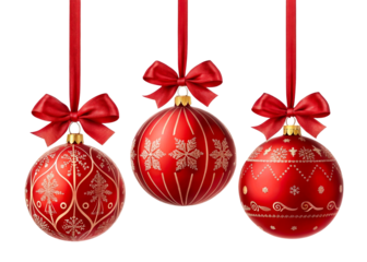 Three red decorative baubles with snowflake patterns hanging by ribbons
