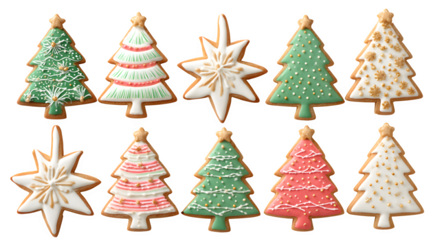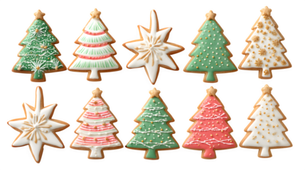 Set of decorated sugar cookies shaped like Christmas trees and stars isolated on white background