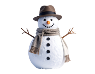 Cheerful snowman wearing hat enjoying winter on transparent background