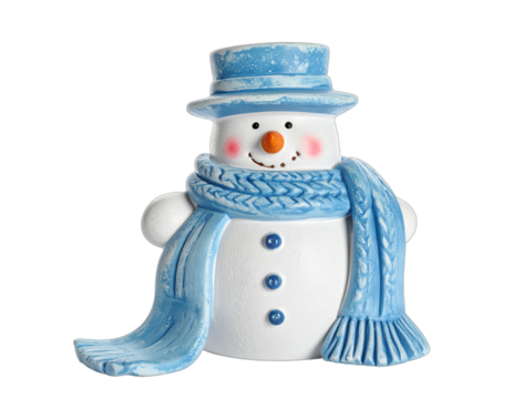 A charming, decorative snowman figure with a blue hat, scarf, and a carrot nose