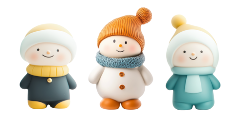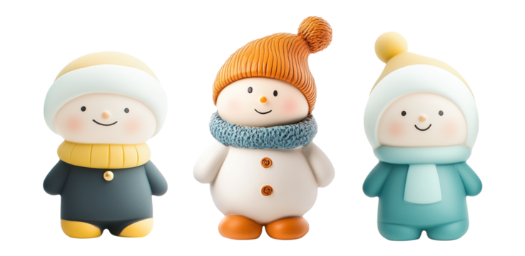 A cheerful collection of cartoon snowmen and a happy child in winter clothing, showcasing various poses and expressions for holiday fun and design isolated on transparent background