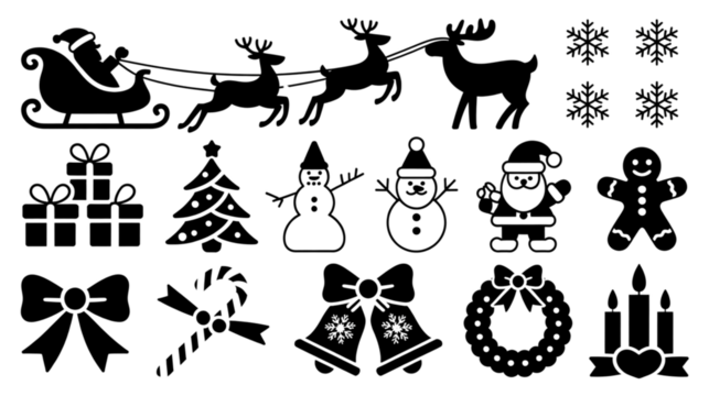 A collection of black and white christmas icons including gifts, trees, snowflakes, and a snowman