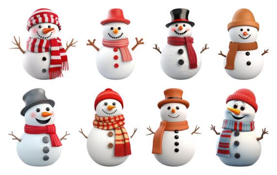 PNG Cheerful snowmen with colorful scarves, element set on transparent background