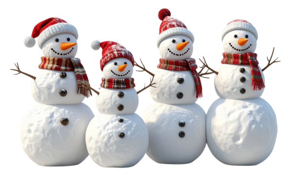 Four cheerful snowmen of varying sizes with stick arms and button details standing together, isolated on a transparent background