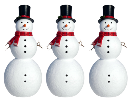 Three smiling snowmen wearing winter clothes on transparent background