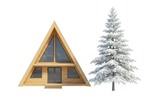 Isolated A-frame house with snowy Christmas tree on seamless background for Xmas holidays