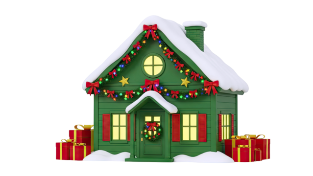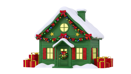 Green Christmas House Decorated with Snow, Lights, and Gifts