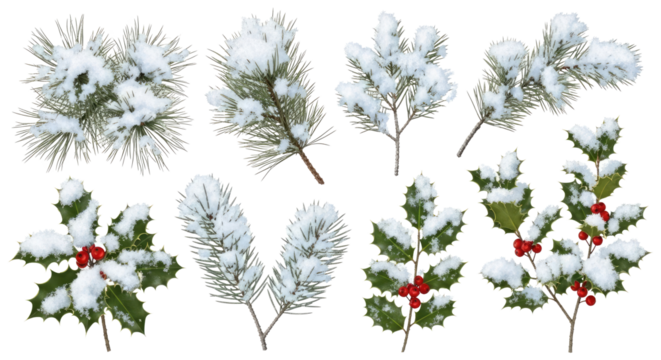 Snow-covered pine branches and holly leaves with red berries.