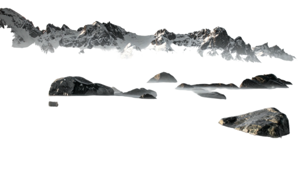 Isolated snowy mountain range and rocky outcrop components