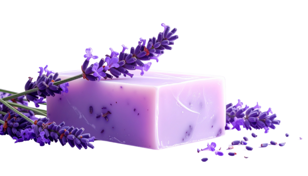 Lavender soap bar with flowers isolated on transparent background