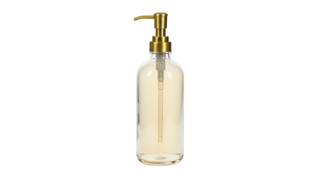 Elegant glass soap dispenser with gold pump isolated, refillable bottle for bathroom or kitchen decor and hand hygiene