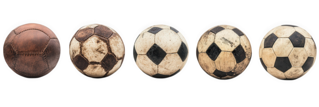 lineup of four soccer balls. showcasing their evolution in design and wear the first ball is brown and vintage. while the subsequent balls display various degrees of wear and tear. transitioning from