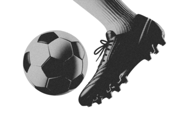 High-contrast black-and-white, grainy texture Close up of soccer boot and ball in action, black and white football technique concept isolated on black background