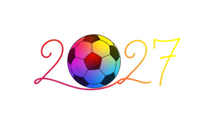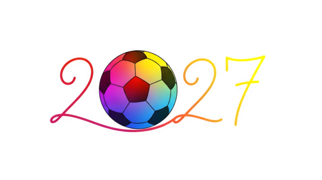 Stylized 2027 Text with Rainbow Gradient Soccer Ball on Black Background
