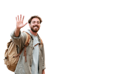 Smiling traveler waving hello with a backpack on a white isolated background.