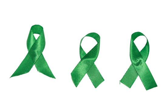 Green Ribbon Tied in a Loop: Supporting Community Initiatives for Awareness on Social Causes Against a Transparent Background.