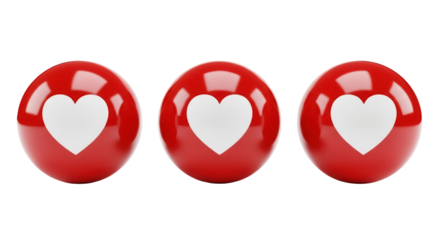 Three red glossy heart emojis PNG isolated on transparent background, social media reaction icons for expressing love and positive sentiment