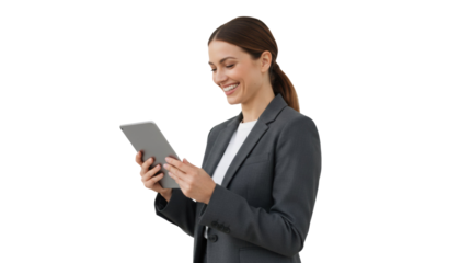 Manager use his tablet for online checking products available on a transparent background