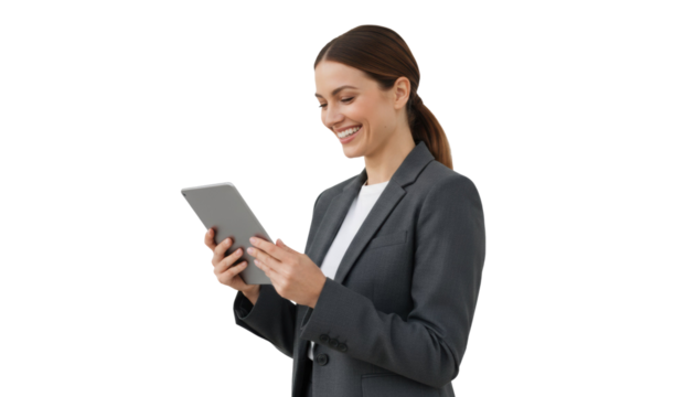 Smiling businesswoman browsing on her digital tablet, checking email and social media updates with excitement