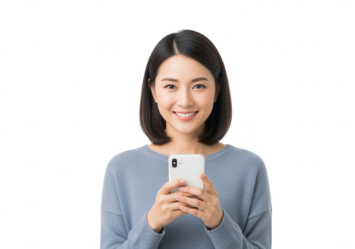 Young woman smiling and holding a mobile phone, texting, communicating, social networking with transparent background