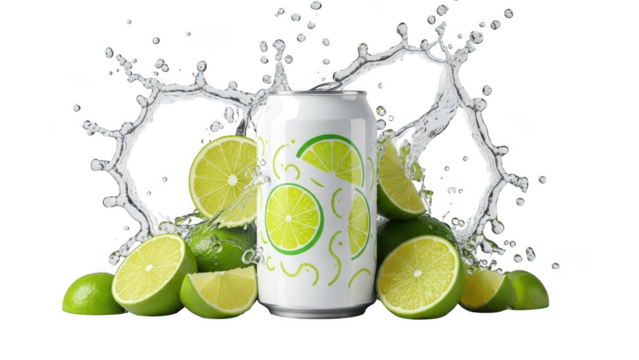 White soda can with lime slices and water splash isolated on transparent background Keywords