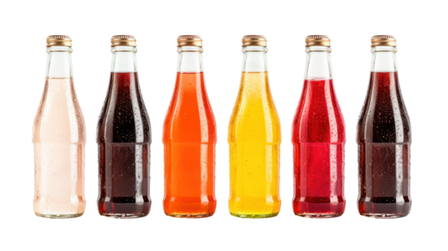 Four soda cans two metallic silver one white with gold pull tab and one red standing in a row transparent background