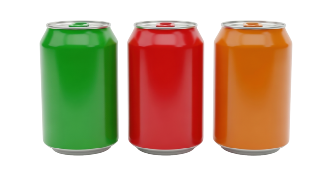 Isolated cans of soda pop or soft drink in vivid bright colors on neutral surface