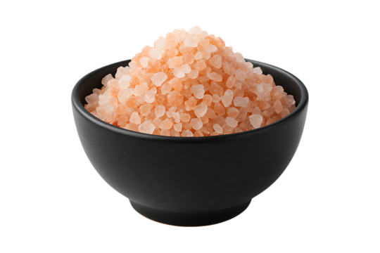 Himalayan Pink Salt Crystals in Black Bowl Isolated on a Transparent Background
