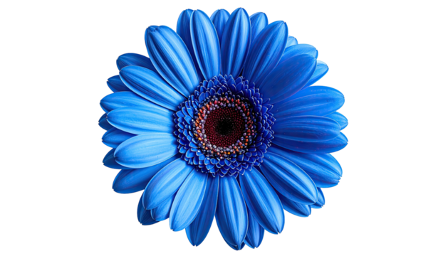 Close-up of a vibrant blue Gerbera daisy with a dark brown center, isolated on black