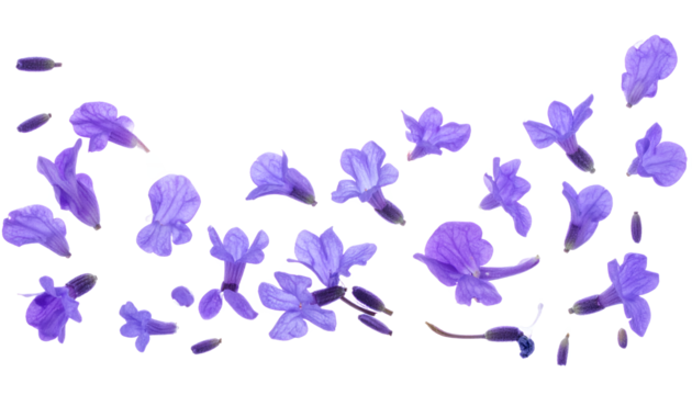 A delicate and vibrant scattering of small purple flower petals and blossoms, beautifully arranged on a clean white background, evoking freshness and natural beauty for spring and summer themes