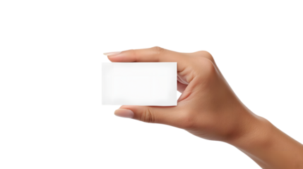 Hand holding blank white business card with fingers curled around edges in soft natural lighting for corporate branding and marketing materials