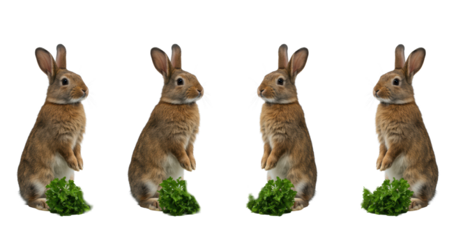 Four meticulously groomed brown rabbits standing upright, alert, with green parsley sprigs, on seamless gray studio background, commercial product concept