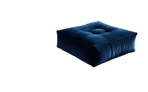 A soft velvet floor cushion in a deep blue shade on a empty plain background