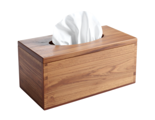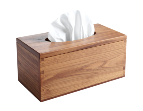 Wooden tissue box with soft, white tissues sticking out