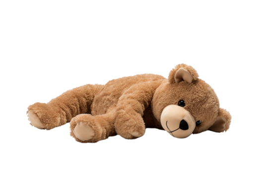 A soft brown teddy bear lying down with a  in a close up shot transparent background png