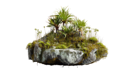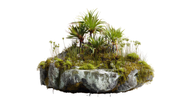 Miniature rock garden, lush moss, ferns, and small plants,  atop a textured rock,  isolated, wet, detailed