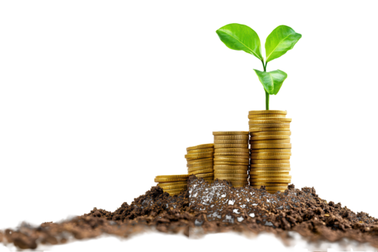 Stacked gold coins rise from soil with a green plant sprouting, symbolizing growth and prosperity in investment and nature