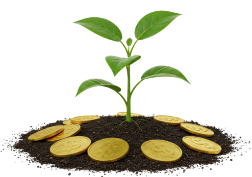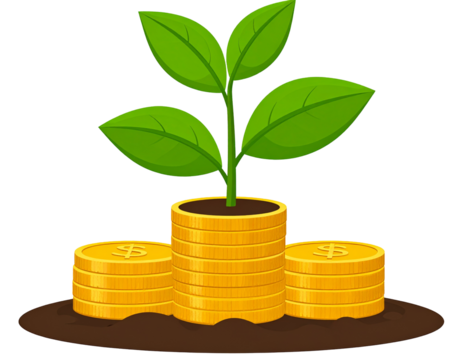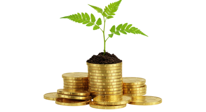 A stylized illustration of a small plant growing from a stack of gold coins