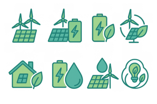 Eco-friendly energy icons: solar, wind, battery, and sustainability set