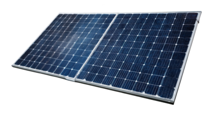 Solar panel array with three panels mounted on a metal frame isolate on transparent background, png, cutout