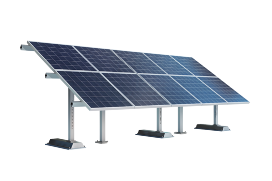 Row of solar panels with reflective surface, sustainable energy, solar technology, modern renewable power source, clean electricity generation, isolated on transparent background, photovoltaic cells