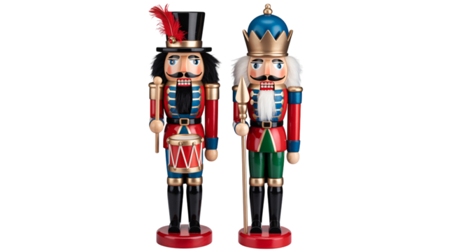 Traditional wooden nutcracker soldiers with ornate uniforms and hats displayed together isolated on transparent background