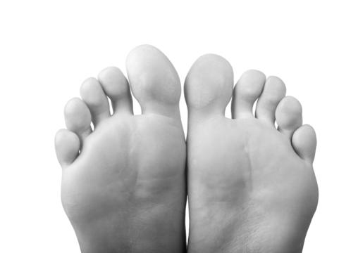 Grayscale barefoot female feet with smooth skin and neat toes, back view showing sole and pad. Beautiful anatomy, pedicure, and health concepts. Clean and soft, isolated on white